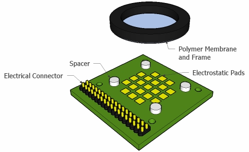 The polymer membrane deformable mirror technology is easily customized and scalable to up to 6″ diameters. The mirrors can be coated for reflectivity with virtually any metal coating. We are currently working on demonstrating multi-layer dielectric stack high reflectivity coatings. By leveraging printed circuit board technology for the actuators, we can quickly generate custom actuator patterns. The picture to the left is of the core of a typical 1″ diameter aluminum coated membrane deformable mirror (without its packaging).